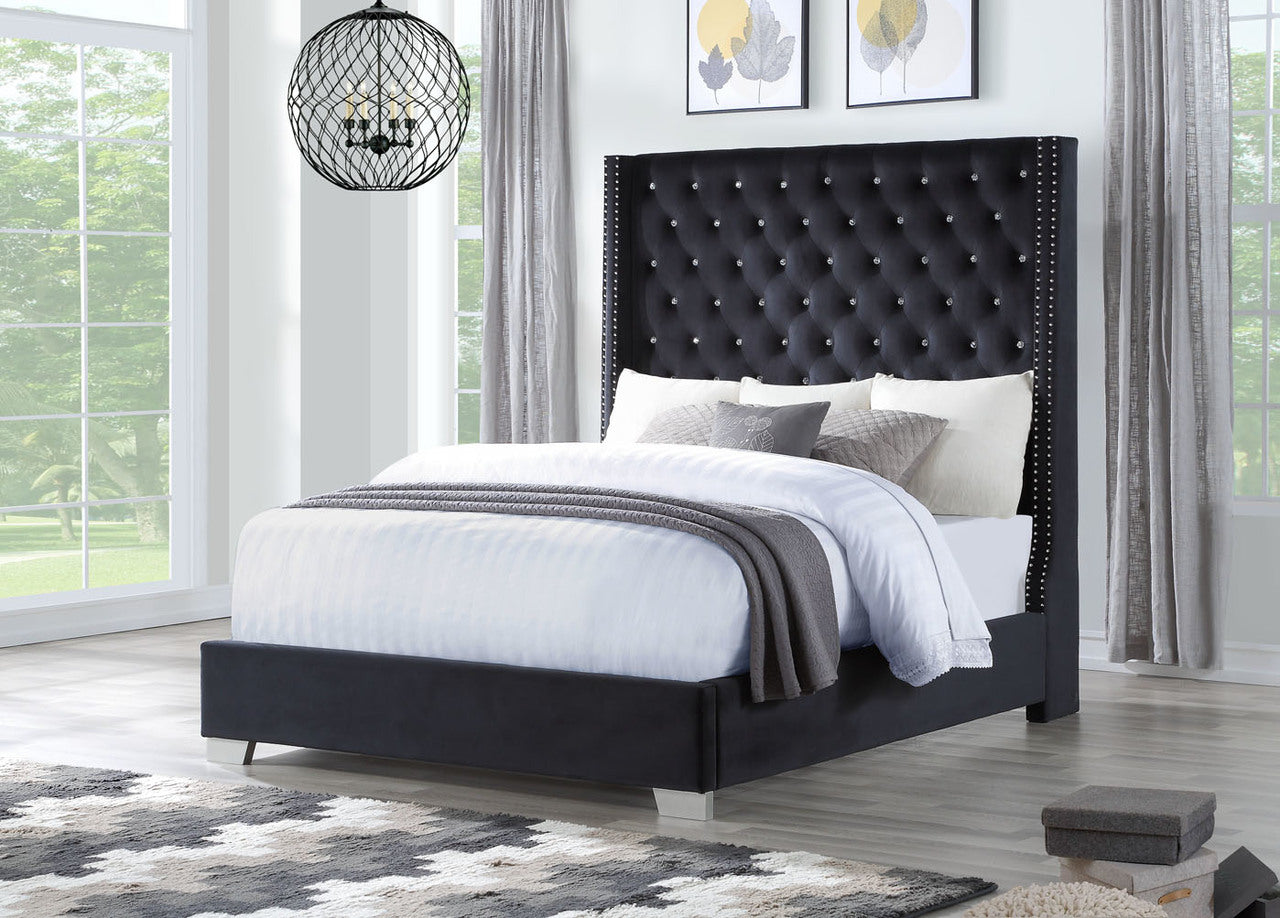 The Aria is a black fabric upholstered bed, tufted with crystals and has chrome nail head trim.