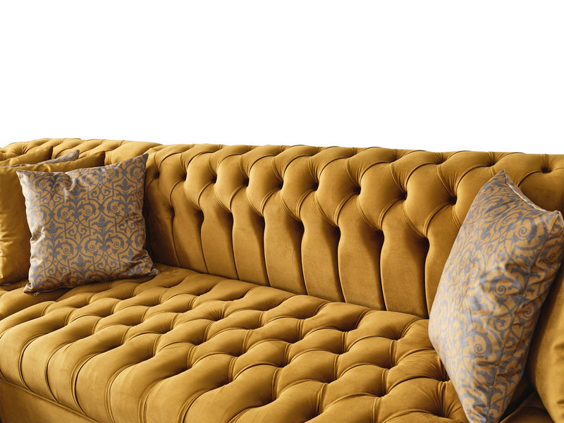 Lauren is our most charming, luxury double chaise sectional boasting a fusion of contemporary and classic style. This sectional comes with complete sets of gold legs and eight designer pillows.